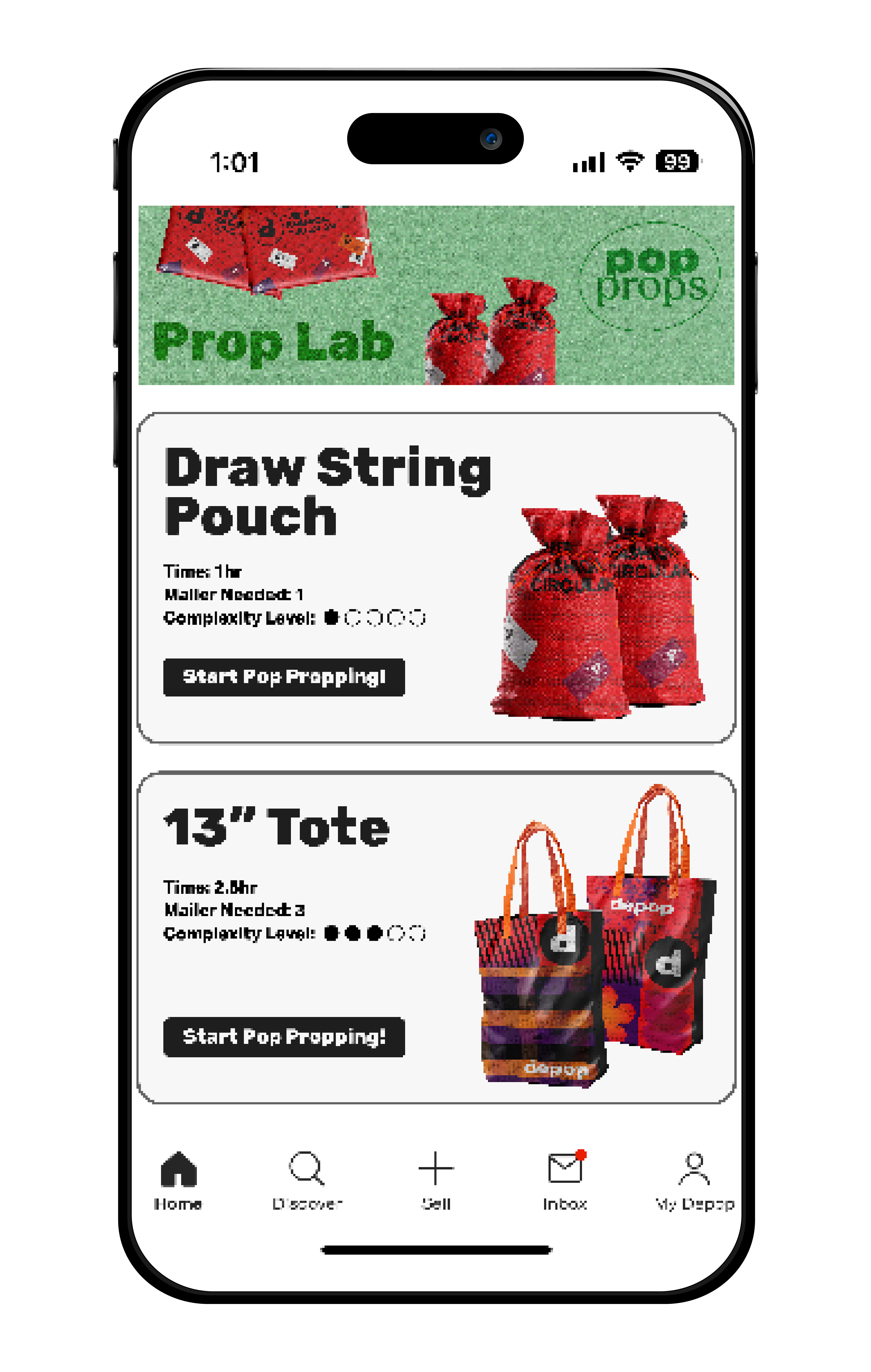 In-app section: “Prop and Share”, where users can share their upcycled mailer creations and “Prop Lab”, where they can learn how to transform them into unique accessories.